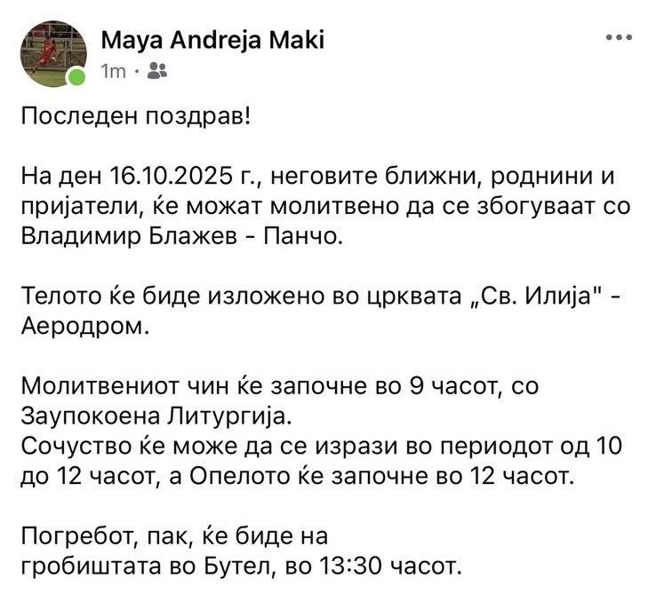 Утре, на 16 октомври, роднините, пријателите и сите кои го познаваа и сакаа Владимир Блажев – Панчо ќе имаат можност да се простат од него и да му оддадат последна почит, информираше неговата сопруга.